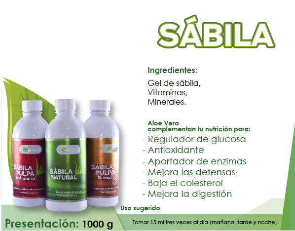 La SÁBILA funciona como un potente antiviral, además de que contiene muchos aminoácidos, tales como el ácido glutámico, ácido aspártico, alanita, arginina, glicina, entre otros. Ayuda a regular la glucosa del organismo previniendo y tratando la diabetes; aporta gran cantidad de enzimas, contiene propiedades que ayudan a reducir el colesterol y mejorar la circulación. Mejora la digestión y trata los problemas del aparato digestivo. Consumir SÁBILA cuando hay debilidad por alguna enfermedad ayuda a mejorar las defensas y disminuye las grasas del organismo. Reduce tumores, previene cálculos renales y baja la presión arterial.