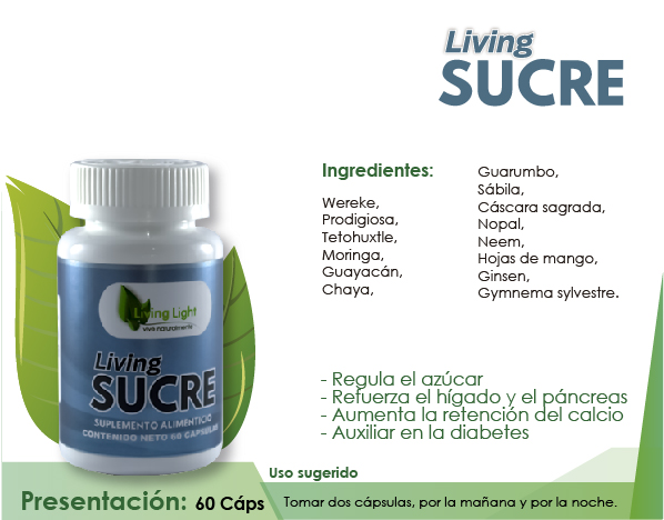 Cada año se diagnostican 1.9 millones de nuevos casos de diabetes en el país. Y hay en total cerca de 26 millones de personas que la sufren. Los altos niveles de azúcar en la sangre pueden ser un grave peligro para tu salud y tu vida. LIVING SUCRE y su extraordinaria fórmula es efectiva para regular el nivel de azúcar en la sangre, dado que ayuda a optimizar el uso de la insulina segregada por el páncreas. También es útil para mejorar los impulsos nerviosos y la circulación sanguínea. Así como ayuda a combatir el estrés, factor que empeora los síntomas de la diabetes.
