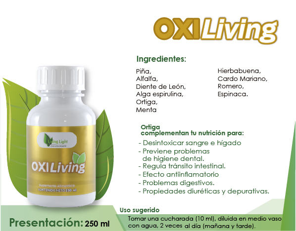 Ya habrá notado que hay días en los que simplemente nuestro cuerpo no responde como nosotros quisiéramos, lo que termina por afectar nuestra rutina. OXILIVING contiene una combinación exclusiva que ayuda a nuestro cuerpo a desechar toxinas, a oxigenar nuestra sangre, además de ayudar a un buen funcionamiento de nuestro organismo, fortaleciendo nuestro sistema inmune, ya que muchos de los virus y bacterias no sobreviven en los ambientes bien oxigenados. Además de prevenir el mal aliento con su fresco sabor a menta.